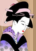 Een sierlijk Japans schilderij van een in dagdromen verzonken Japanse geisha, gekleed in een sierlijke kimono, in een minimalistisch gouden, roze en okerkleurig landschap.