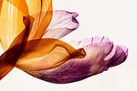 De oranje bladeren lopen qua kleur bijna over in de roze gekleurde tulpenbladeren, omdat deze ook een oranje teint in zich hebben. Door de transparantie en overlapping in de bladeren, wordt er een bijna abstract lijnenspel zichtbaar.