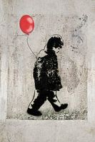 Een ballon in het rood danst met hem mee.