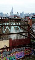 Skyline van New York met de empire State Building achter een muur van graffiti in Brooklyn.