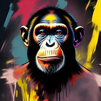 De speelse chimpansee lijkt bijna tot leven te komen, met een ondeugende twinkeling in zijn ogen en een brede grijns die de toeschouwer uitnodigt tot een glimlach. De graffiti-invloeden spatten van het doek, waardoor het geheel een urban en eigentijdse uitstraling krijgt. De kleurrijke achtergrond weerspiegelt de chaos van het leven, terwijl de compositie toch een harmonieus geheel vormt.