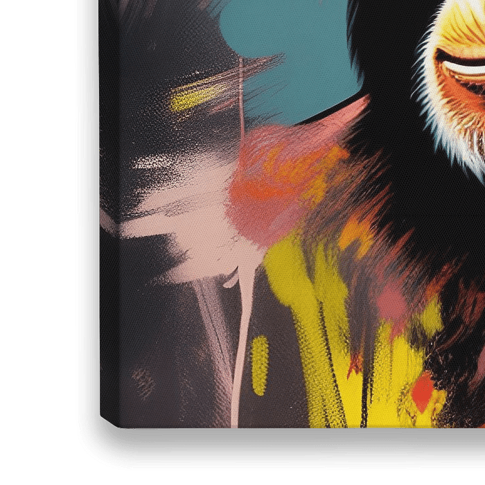 Het doek straalt een onweerstaanbare levendigheid uit met een vrolijke chimpansee als stralend middelpunt. De kleuren dansen als een crescendo van vreugde, waarbij de schakeringen van het apenportret samenkomen in een feest van expressieve penseelstreken.