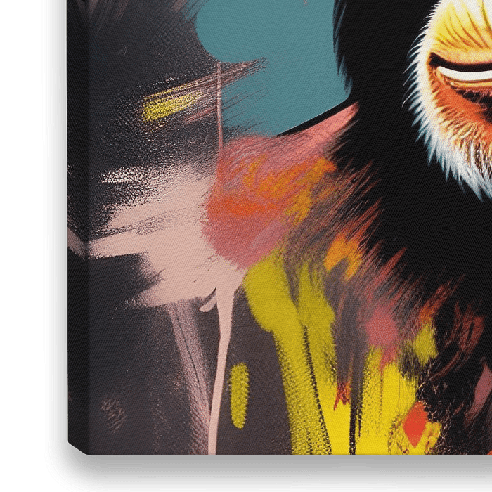 Het doek straalt een onweerstaanbare levendigheid uit met een vrolijke chimpansee als stralend middelpunt. De kleuren dansen als een crescendo van vreugde, waarbij de schakeringen van het apenportret samenkomen in een feest van expressieve penseelstreken.