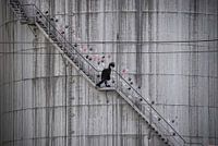 originelles Graffiti an einem riesigen grauen Industrietank mit Aussentreppe