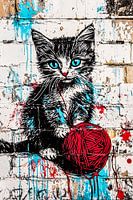 Dit unieke kunstwerk brengt de levendigheid van straatkunst samen met de speelsheid van een kat die een bol wol vasthoudt. De levendige kleuren, zoals blauw en rood, gecombineerd met zwart-wit accenten, maken dit ontwerp een opvallende keuze voor elk interieur. Het graffiti-effect zorgt voor een moderne uitstraling, terwijl de schattige…