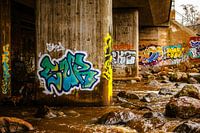 Graffiti onder Brug – Rivier & Rotsen in Warm Licht van Broodrooster Studio – Creatieve Fotografie