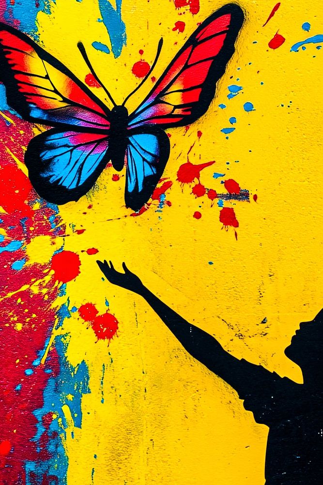 Een levendige en dynamische afbeelding van een vogel in volle vlucht, weergegeven in een kleurrijke street art-stijl. De verfspetters en heldere tinten blauw, rood, en geel geven het ontwerp een energieke en moderne uitstraling. Perfect als decoratie voor een kantoor of woonkamer, en een echte blikvanger voor liefhebbers van unieke en creatieve kunst.