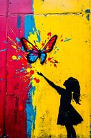 Een levendige en dynamische afbeelding van een vogel in volle vlucht, weergegeven in een kleurrijke street art-stijl. De verfspetters en heldere tinten blauw, rood, en geel geven het ontwerp een energieke en moderne uitstraling. Perfect als decoratie voor een kantoor of woonkamer, en een echte blikvanger voor liefhebbers van unieke en creatieve kunst.