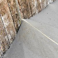 Een mooi strak grafisch lijnenspel gevormd door een streep zonlicht die tussen ruw houten planken valt op een stuk opgewaaid fijn strandzand.