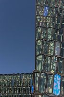 Slechts een fragment van het tot de verbeelding sprekende gebouw Harpa. Het muziekcentrum van Reykjavik, een prestigieus project dat met enige tegenslagen zijn realisatie in 2012 bereikte. Een parel aan de haven van Reykjavik.