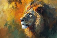 Een levendig kleurenpalet danst op het doek, waar de kracht van de leeuw tot leven komt. Het koninklijke dier wordt afgebeeld in een explosie van warme tinten, van diep goud tot krachtig amber. De gestileerde lijnen vormen een gedurfde compositie, waar de gratie van de leeuw zich vermengt met de energie van zijn habitat. Het oog wordt getrokken naar de oren, fier opgeheven als poortwachters van het wild. Het geheel ademt vitaliteit uit, een bruisende viering van de natuur. Een visuele symfonie van kleur en vorm, die de kracht en schoonheid van de leeuw op een eigentijdse manier viert.