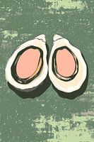 Dit minimalistische kunstwerk presenteert een opvallende compositie met twee oesters als middelpunt, tegen een grungy groene achtergrond. De oesters zijn weergegeven in contrasterende tinten roze en taupe, wat een subtiel maar boeiend visueel samenspel creëert.