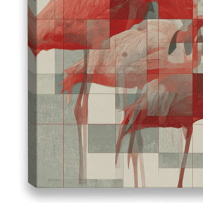 Een grafische collage van flamingo’s in roodtinten, verweven met transparante geometrische vlakken en overlappende rechthoeken. Het samenspel tussen organische vormen en strakke lijnen creëert een dynamisch ritme dat zowel modern als kunstzinnig aanvoelt. Een uitgesproken statement piece voor een eigentijdse ruimte.