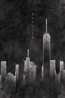 Een silhouet van denkbeeldige nachtelijk New York City. De sfeer weerspiegelt een stedelijke dynamiek. Een decoratief kunstwerk van grafische vormgeving en moderne constructies. Unieke mix van pop art en poster stijl in vintage stijl.