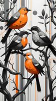 Dit kunstwerk toont een groep goudvinken, karakteristiek met hun opvallende oranje borst en grijze veren, zittend op takken. De abstracte stijl waarin ze zijn weergegeven, maakt gebruik van geometrische vormen en strakke lijnen, wat zorgt voor een moderne en dynamische uitstraling. De contrasterende kleuren, vooral het levendige oranje…