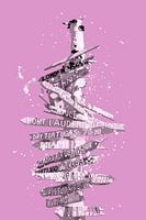 Moderne en decoratieve grafische kunst voor de avontuurlijke. Een verkeersbord geeft de afstanden aan de doelstellingen.