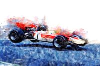 Illustratie van een serie legendarische Formule 1-racers en hun coureurs. Ontworpen uit liefde voor het klassieke racen. Geschilderd met aquarellen op papier.