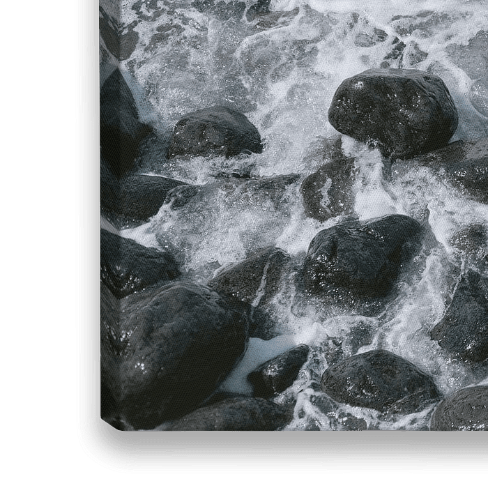 Liggende close-up foto van wilde golven en donkere stenen. Abstracte natuurfoto met contrast tussen het zeewater en de stenen op de bodem.