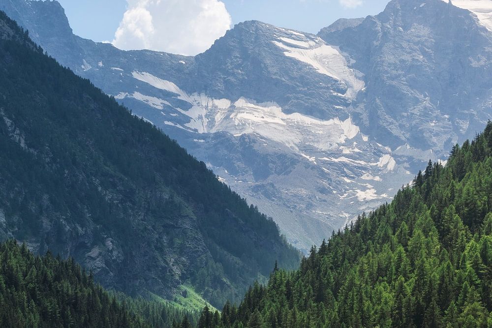 Gran Paradiso massief en dennenbos in Valnontey. Cogne, Aostadal, Italië