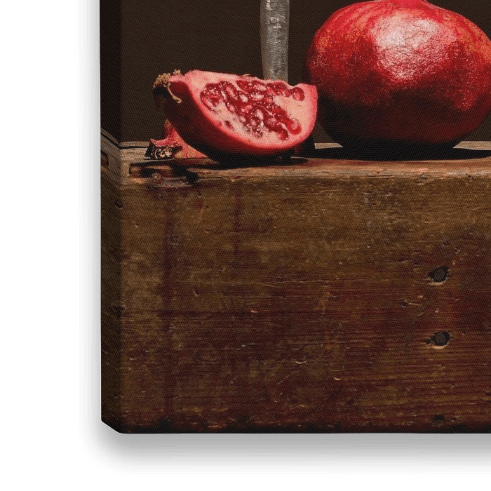 Koop de foto Granaatappel met mes van Gerhard Albicker op canvas, aluminium dibond, (ingelijste) fotoprint, behang en ArtFrame, op maat geprint in Fine-Art kwaliteit.