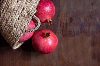 Drie rijpe rode granaatappels liggen in een geweven mand. De mand ligt op een houten tafel