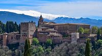 Het beroemde Alhambra in Granada, Spanje, torent uit boven de stad, met op de achtergrond de besneeuwde toppen van de Sierra Nevada.
