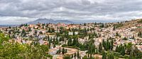 De foto toont een panoramisch uitzicht op de stad Granada, genomen vanaf een verhoogde positie in het Alhambra. Op de voorgrond zijn de historische muren en gebouwen van het Alhambra zichtbaar, gemaakt van roodachtige steen en gekenmerkt door Moorse architectuur. Daarachter strekt de stad zich uit met witte huizen, rode pannendaken en groene vegetatie die harmonieus opgaat in het heuvelachtige landschap. De architectuur van Granada toont een mengeling van Spaanse en islamitische invloeden, herkenbaar aan de gevelvormen en dakconstructies.