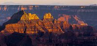 De ondergaande zon verlicht een rood gekleurde en zwaar geërodeerde rotsformatie in de Grand Canyon