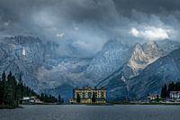 Het Grand Hotel Misurina aan de meer Misurina in Italie met de dolomieten op de achtergrond.