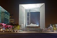 De Grande Arche rond middernacht, middelpunt van het zakendistrict Paris La Defense.