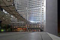 Details van de Grande Arche rond middernacht, middelpunt van het zakendistrict Paris La Defense.