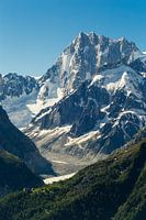 Les Grandes Jorasses (4208m), natuurlijke grens met Italië, adembenemend door zijn grootte, schoonheid en moeilijkheidsgraad. Op de voorgrond het Montenegrijnse aankomststation om de Mer de Glace te bereiken.