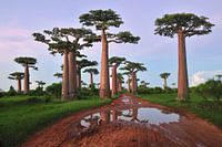 Grandidier's Baobab (Adansonia grandidieri) bomen langs de weg bij zonsondergang nabij Morondava, Madagaskar, Afrika. © Thomas Marent / MP / Nature in Stock