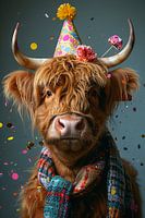 Een grappige foto van een Highland koe in feestkleding die een verjaardagsfeestje viert in de stijl van de jaren 60 en 70.
