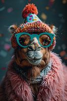 Feeststemming met een kameel met een kleurrijke bobblehoed op die een heerlijke taart balanceert.