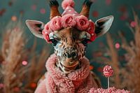 Een verrassend portret van een giraffe die haar verjaardag viert in een jaren 60-70 disco-outfit met pluizige feesthoedjes en ronde brilletjes.