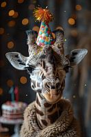 Een verrassend portret van een giraffe die haar verjaardag viert in een jaren 60-70 disco-outfit met pluizige feesthoedjes en ronde brilletjes.