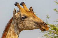 Een Giraffe (Giraffa camelopardalis) torent hoog boven me uit terwijl ze graast van een Kameeldoorn boom. Op de kop zit een Ossenpikker, waardoor het beeld een ontspannen en grappige uitstraling krijgt. De Giraffe lijkt zich weinig aan te trekken van de aanwezigheid van het vogeltje op z'n kop. Wellicht realiseert de Giraffe zich dat de Ossenpikker allerlei lastige insecten en ander ongedierte van z'n huid verwijderd. Ik maakte de foto in het Moremi Game Reserve in het noorden van Botswana.
