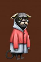 Dit portret van een zwarte hond met hoodie jas is volledig digitaal gemaakt door middel van kunstmatige intelligentie.