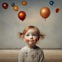 Grappig surrealistisch kinderportret van een kleuter met staartjes en rode wangetjes. Het meisje draagt een tuinbroekje . Ze kijkt vermakelijk naar ballonnen boven haar hoofd.