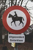 Een grappig verkeersbord in Berlare, Oost-Vlaanderen, België. Paardrijden verboden, behalve natuurlijk als je Sinterklaas bent. Echt bord, Vlaamse humor! Seizoensgebonden muurkunst om te lachen.