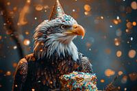 Grappige afbeelding van een adelaar met een feesthoed, omringd door kleurrijke confetti, symboliseert een gelukkige verjaardag.