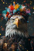 Grappige afbeelding van een adelaar met een feesthoed, omringd door kleurrijke confetti, symboliseert een gelukkige verjaardag.