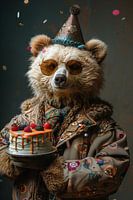 Een beer in jaren 60/70 discokleding houdt een verjaardagstaart vast en draagt een feestmuts en coole zonnebril.