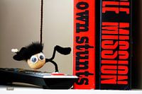 Een close up van een nagespeelde scene van de film Mission Impossible met Tom Cruise. De Fubby hangt in een boekenkast om een afstands bediening te bedienen zonder de grond aan te raken. Een van de stunt die de acteur zelf uitvoerde.