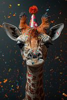 Een giraffe met een feestmuts viert op humoristische wijze haar verjaardag in de stijl van de jaren 60 en 70 met een taart voor een glinsterende achtergrond.