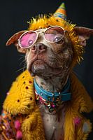 Een hond in jaren 60-70 discokostuum viert zijn verjaardag met taart en confetti.