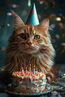 Een schattig katje met een feestmuts kijkt naar een verjaardagstaart, omringd door feestelijke decoraties en warme lichtjes.