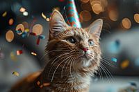 Een schattig katje met een feestmuts kijkt naar een verjaardagstaart, omringd door feestelijke decoraties en warme lichtjes.