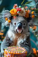 Een koala viert zijn verjaardag, gekleed in een leuke jaren 60-70 discostijl, omringd door kleurrijke bloemen en een taart.